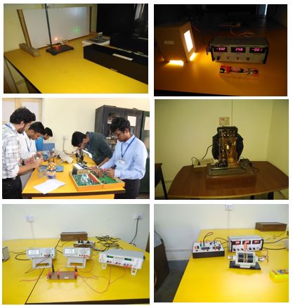Some of the Instruments available in the lab are: Ultrasonic Interferometer, Solar Cell, Hall Effect Apparatus, Ultrasonic Distance Meter, Crystal Blocks (SCC, BCC, FCC etc.), P-N Junction Band gap measurement setup, He-Ne Lasers (632.8nm, 543.5nm & 612nm), Semiconductor diode lasers ( 650nm), Travelling microscopes, Plank’s Constant Apparatus, Optical spectrometers, Optical sources(Na, Hg, Ne), Diffraction gratings (1D & 2D), Newton’s Rings Apparatus, Air Wedge interference apparatus, Fibre Optic trainer kit, Thermocouple experimental set up, Cathode Ray Oscilloscopes, Signal Generators, Digital Multi Meters, Regulated Power Supplies, etc.