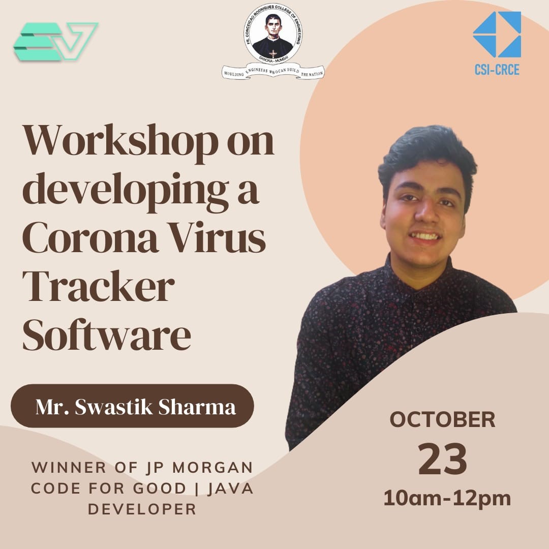 CSI conducted a “Workshop on Developing A Corona Virus Tracker Software” on 23rd October 2021. 78 students participated. The outcome of the workshop was that all the students learned about python programming and understood how real-life problems are handled. The session helped the students learn the basic concepts that are necessary for building up their python programming skills. It enlightened the students to keep working on such problems. The poster for the event is given below: