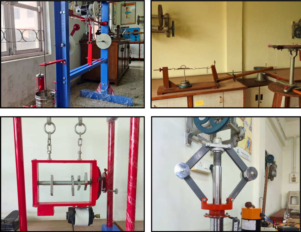 It facilitates experimentation related to mechanics with Force Table Apparatus, Coil & Belt Friction Apparatus, Friction Slide Apparatus, Simple Beam Apparatus, Collision of Elastic Bodies Apparatus, Bell Crank Lever, Friction Slide Apparatus as well as experimentation related to dynamics of machines with static & dynamic balancing apparatus, Whirling Speed of shaft, Gyroscope, Governor, Cam analysis apparatus, Coriolis Component of acceleration, Piezoelectric Vibrometer and Vibration Apparatus.
